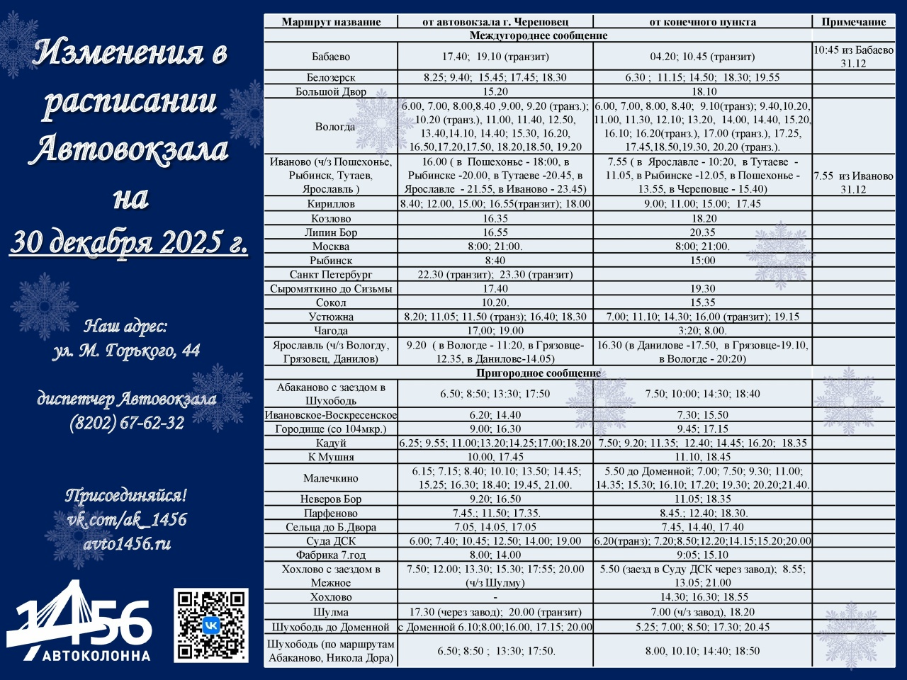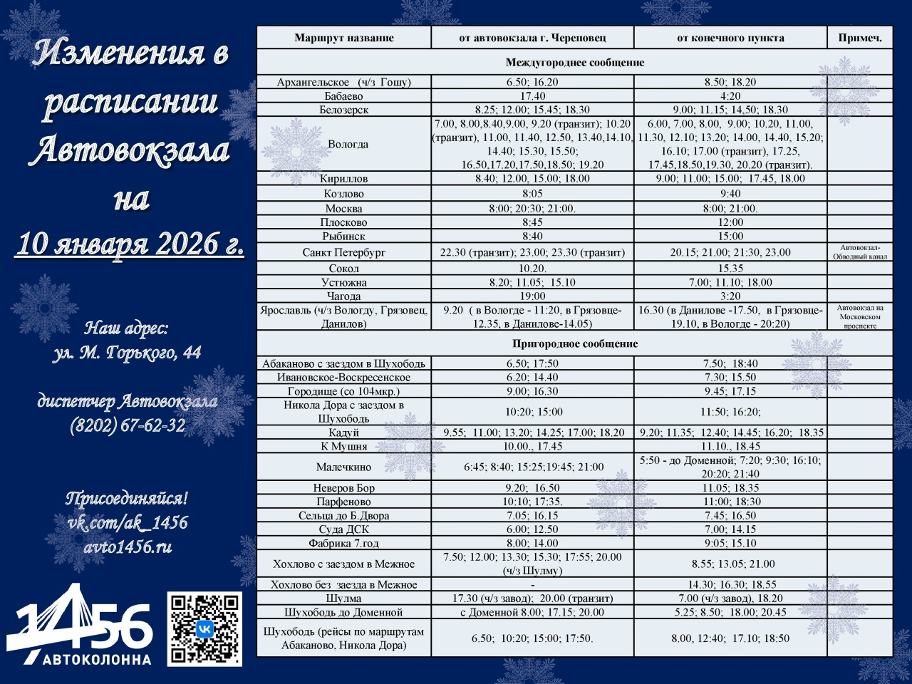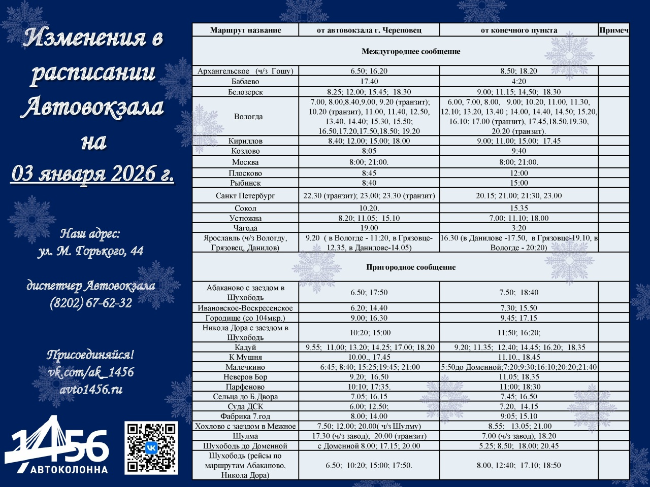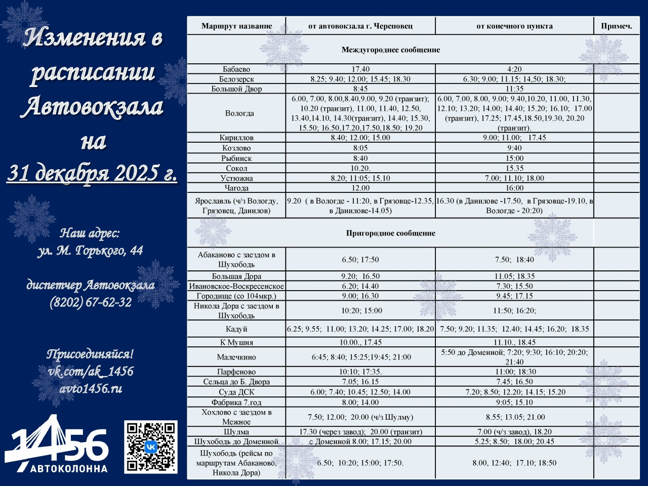 Специальное расписание междугородних и пригородных маршрутов опубликовала «Автоколонна №1456». Корректировки рейсов сделаны по ключевым направлениям, таким как Вологда, Москва, Санкт-Петербург, Бабаево и другие.