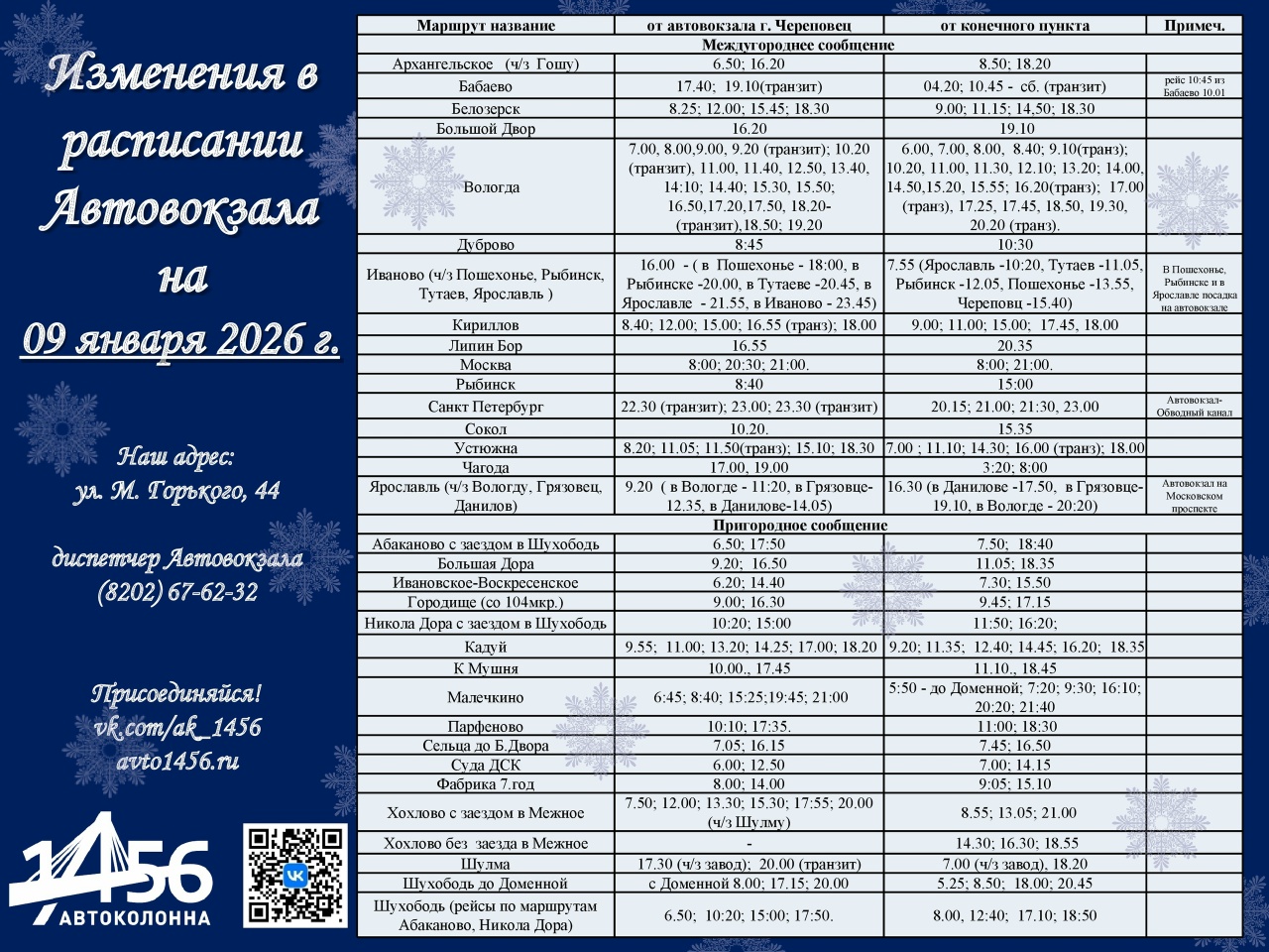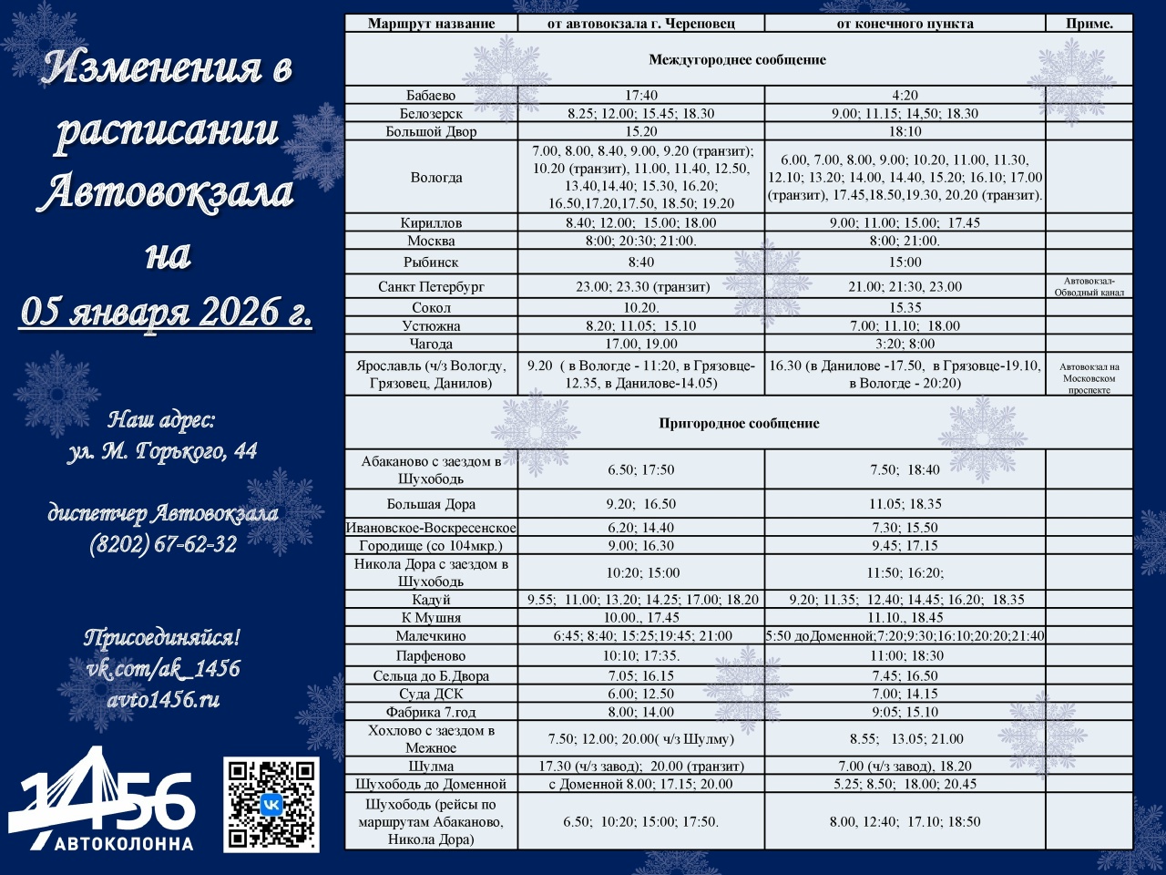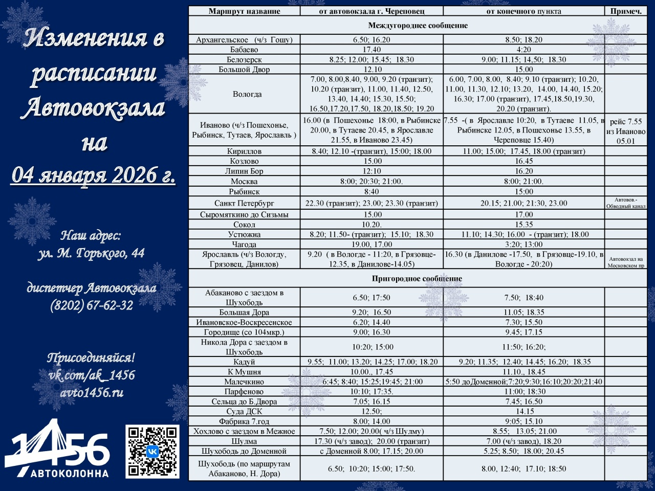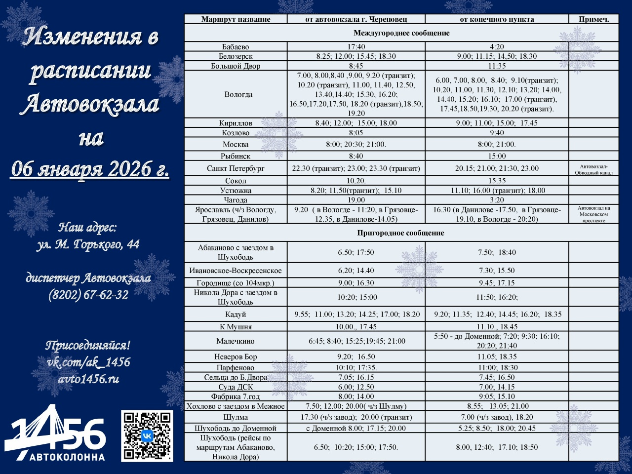 Специальное расписание междугородних и пригородных маршрутов опубликовала «Автоколонна №1456». Корректировки рейсов сделаны по ключевым направлениям, таким как Вологда, Москва, Санкт-Петербург, Бабаево и другие.