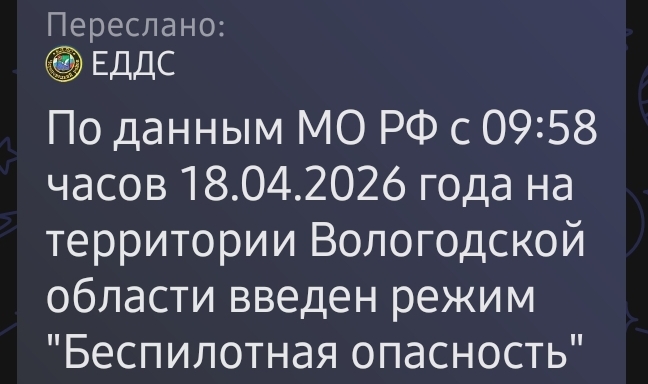 В 9:58 Минобороны РФ подтвердили информацию об угрозе атаки беспилотных летательных аппаратов (БПЛА) на территории Вологодской области, в том числе в Череповце и Череповецком округе.