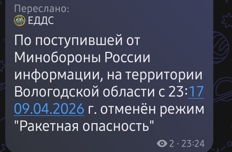 UPD: Режим «Ракетная опасность» по всем ранее объявленным регионам отменён. По поступившей от Минобороны России информации, с 23:17 9 апреля режим «Ракетная опасность» на территории Вологодской области также отменён.
