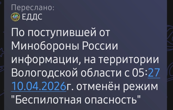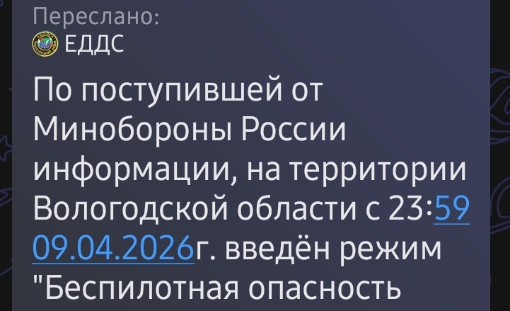 UPD: По поступившей от Минобороны России информации, на территории Вологодской области с 23:59 9 апреля был введён режим «Беспилотная опасность», который был отменён в 5:27 10 апреля.