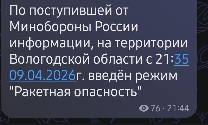 По информации, распространенной в чатах территориальных отделов по Череповецкому округу, с 21:35 9 апреля на территории Вологодской области впервые введен режим «Ракетная опасность». Соответствующее предупреждение поступило главам и руководителям территориальных отделов от Министерства обороны России. Такой же режим введён в Ярославской, Ивановской, Костромской и других областях.