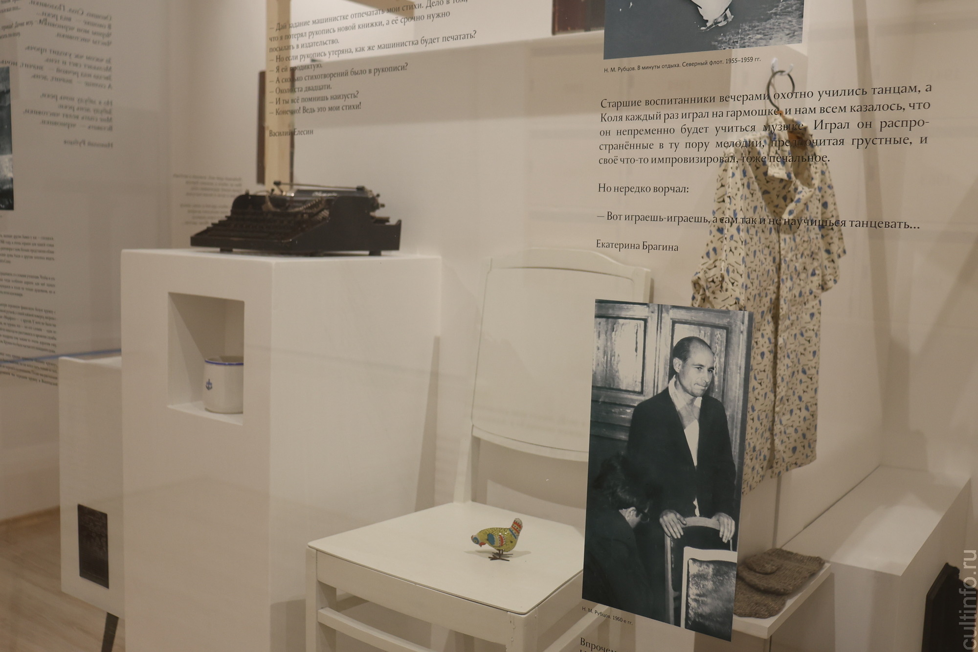 В новом музее Рубцова в Вологде пять залов. В зале «Быт поэта» располагается инсталляция, где представлены личные вещи Николая Михайловича, сопровождавшие его на протяжении жизни и в его бесконечных скитаниях: чемодан, рубашка, печатная машинка, гармонь, кружка, варежки. Здесь также можно увидеть сборники стихов Рубцова, вышедшие при его жизни, диплом об окончании Литературного института им. А.М. Горького и удостоверение члена Союза писателей СССР. В этом же зале можно прочитать письма разных лет, которые лежат в почтовых ящиках.