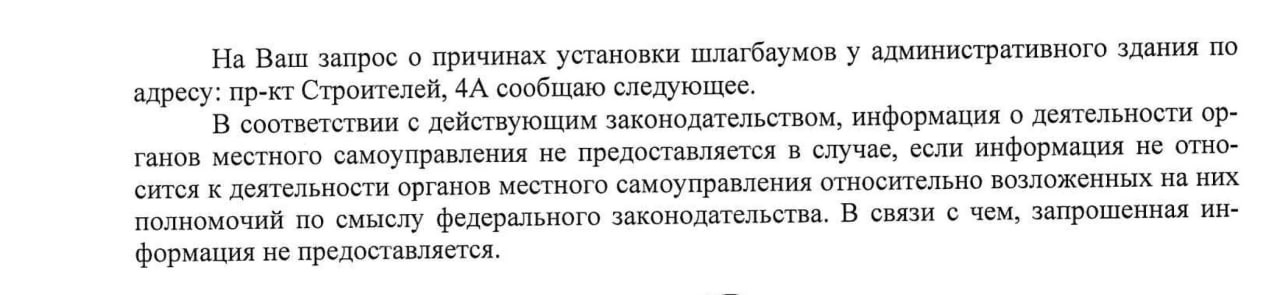 Мы направили в мэрию вопрос, чтобы узнать, почему и у этого здания, и рядом со зданием на пр. Строителей, 2, шлагбаумы на подъездных путях.