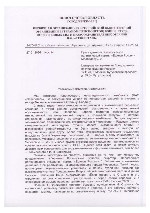 «Считаем необходимым обратить внимание на то, что эту инициативу продавливает губернатор Вологодской области, секретарь Вологодского регионального отделения партии "Единая Россия" Г. Филимонов и оказывает давление в её реализации на администрацию города Череповца. Такой подход противоречит идеологической установке и Вашей публичной позиции как высокоавторитетного Председателя Всероссийской политической партии "Единая Россия". Напомним Ваше высказывание: "Если говорить о Сталине и его окружении, то они совершили преступление и перед своим народом, и в определенном смысле перед историей"».Напомним, памятник Сталину и Бардину хотят поставить на улице Металлургов. Сейчас проходит конкурс заявок на лучший эскизный проект. В комиссии присутствует отец губернатора Вологодской области Юрий Филимонов.