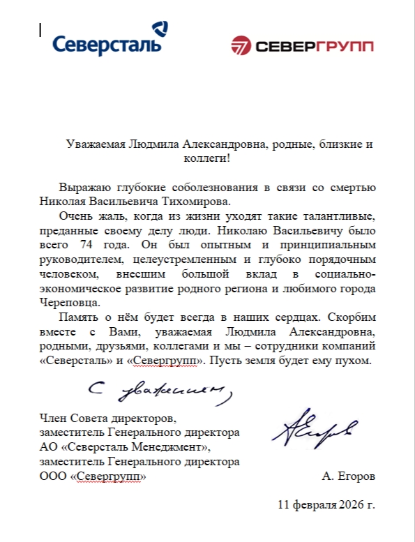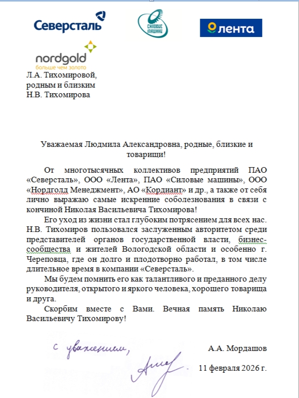 От многотысячных коллективов предприятий ПАО «Северсталь», ООО «Лента», ПАО «Силовые машины», ООО «Нордголд Менеджмент», АО «Кордиант» и др., а также от себя лично выражаю самые искренние соболезнования в связи с кончиной Николая Васильевича Тихомирова!