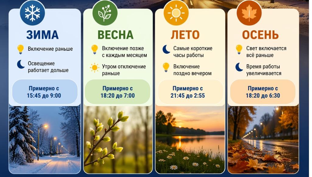 Жители могут сверить время включения и отключения фонарей с учётом сезона