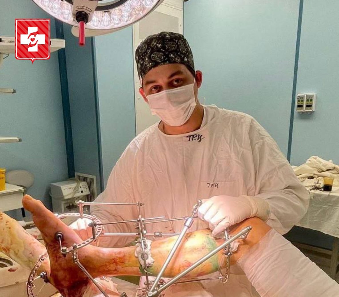 «Итальянская пластика» — это метод кожной пластики, при котором сложносоставной кожный лоскут на временной питающей ножке перемещается из других областей тела, в нашем случае с другой ноги. Во время операции нам удалось сформировать лоскут, закрыть обширный дефект стопы и фиксировать конечности в аппаратах Илизарова. В формировании лоскута множество нюансов, однако данный метод позволяет закрыть большие дефекты, обладает высокой приживаемостью. В настоящее время аппараты Илизарова сняты, лоскут рассечен, дефект мягких тканей на обеих ногах закрыт», — рассказали врачи ортопедо-травматологического отделения.