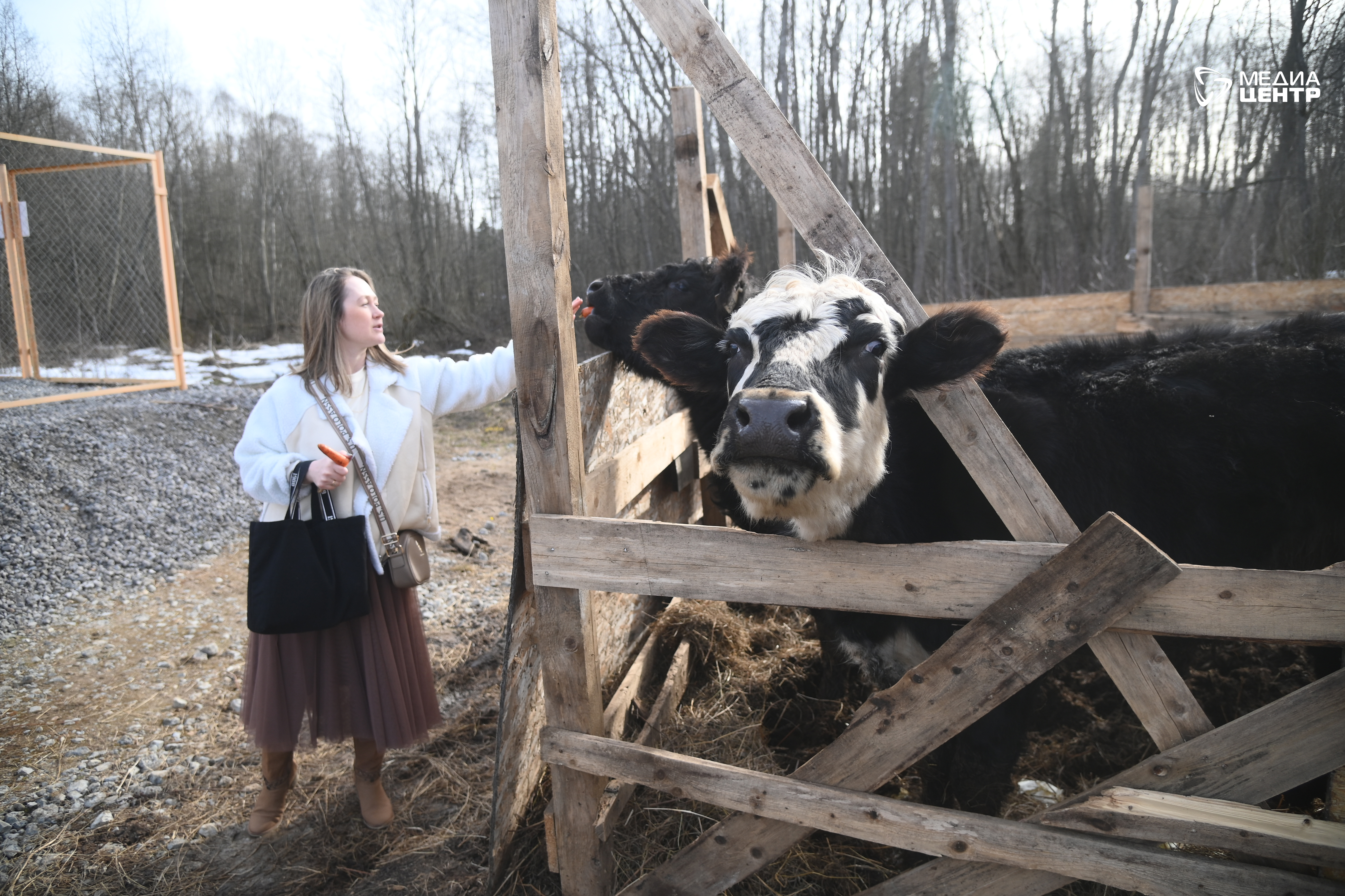 Во вторник, 14 апреля, навестить «узников» и оценить окружающую обстановку отправились и мы. Два теленка, черный и черно-белый, с любопытством выглядывали из загона. Мы протянули им угощение. Хлеб мгновенно исчез с ладони. Поняв, что мы пришли не с пустыми руками, оба начали активно выпрашивать добавки, вытягивая морды и отпихивая друг друга. Затем в ход пошли морковь и яблоки, которые телята тоже охотно поедали, громко хрустя.