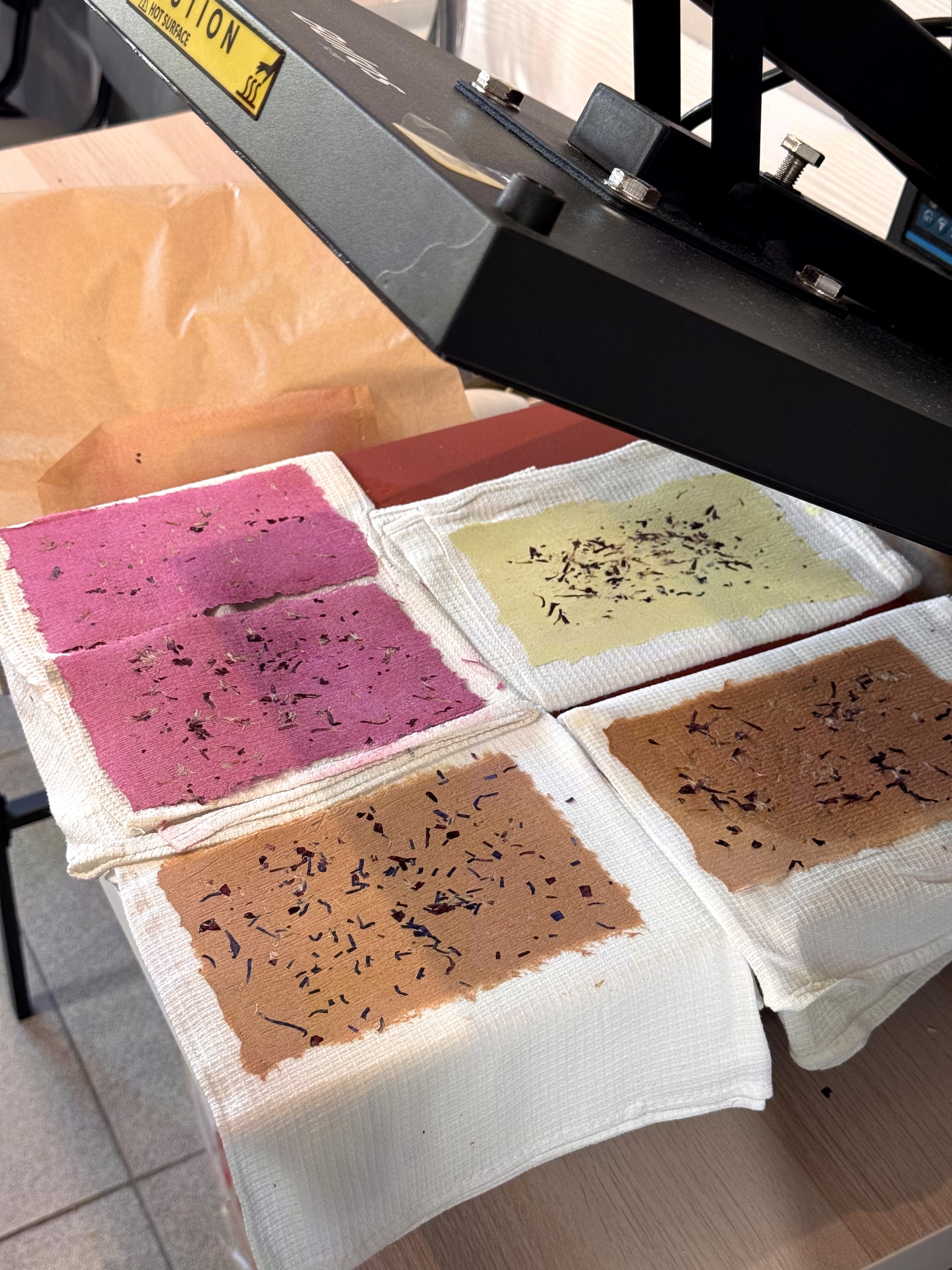 — Сначала рвем упаковку на части. Расход сырья очень маленький. На одну открытку уходит примерно шестая часть лотка на десяток яиц. Складываем их в чашу, заливаем водой и измельчаем ручным блендером. Получившуюся кашицу перекладываем в контейнер достаточной ширины и глубины, чтобы в него помещалась рамка. Рамку брали обычную от фотографий, из нее предварительно убрали стекло и закрепили сетку. Окунаем рамку в получившуюся кашицу. Чем больше раз погружаем, тем плотнее будет открытка. Потом с помощью пергамента и губки убираем лишнюю влагу, переносим заготовку на вафельное полотенце. Рамку с сеточкой аккуратно достаем, а полотенце с заготовкой помещаем под термопресс и высушиваем. Готовые открытки мы украсили сухоцветами. Можно задекорировать узорными штампами, у нас они тоже есть.
