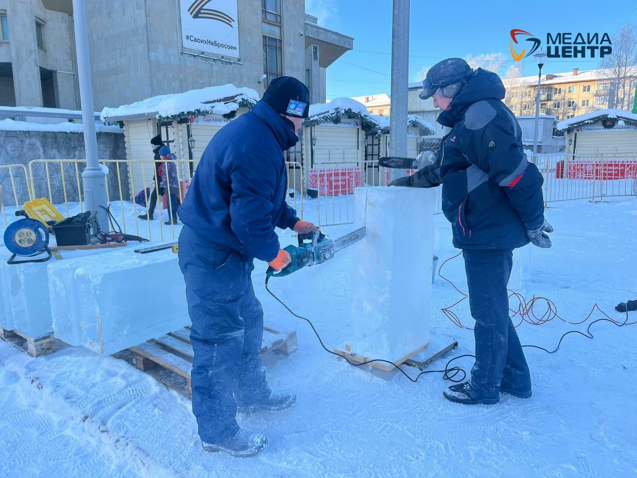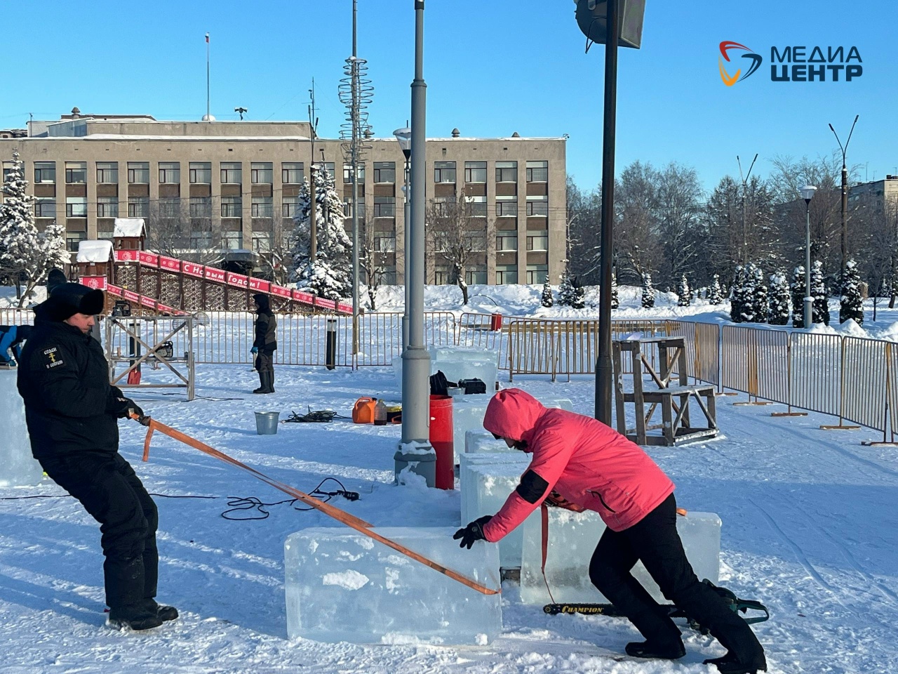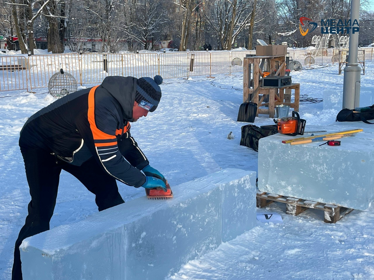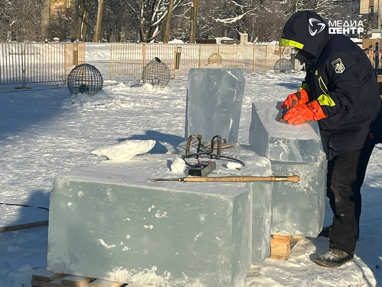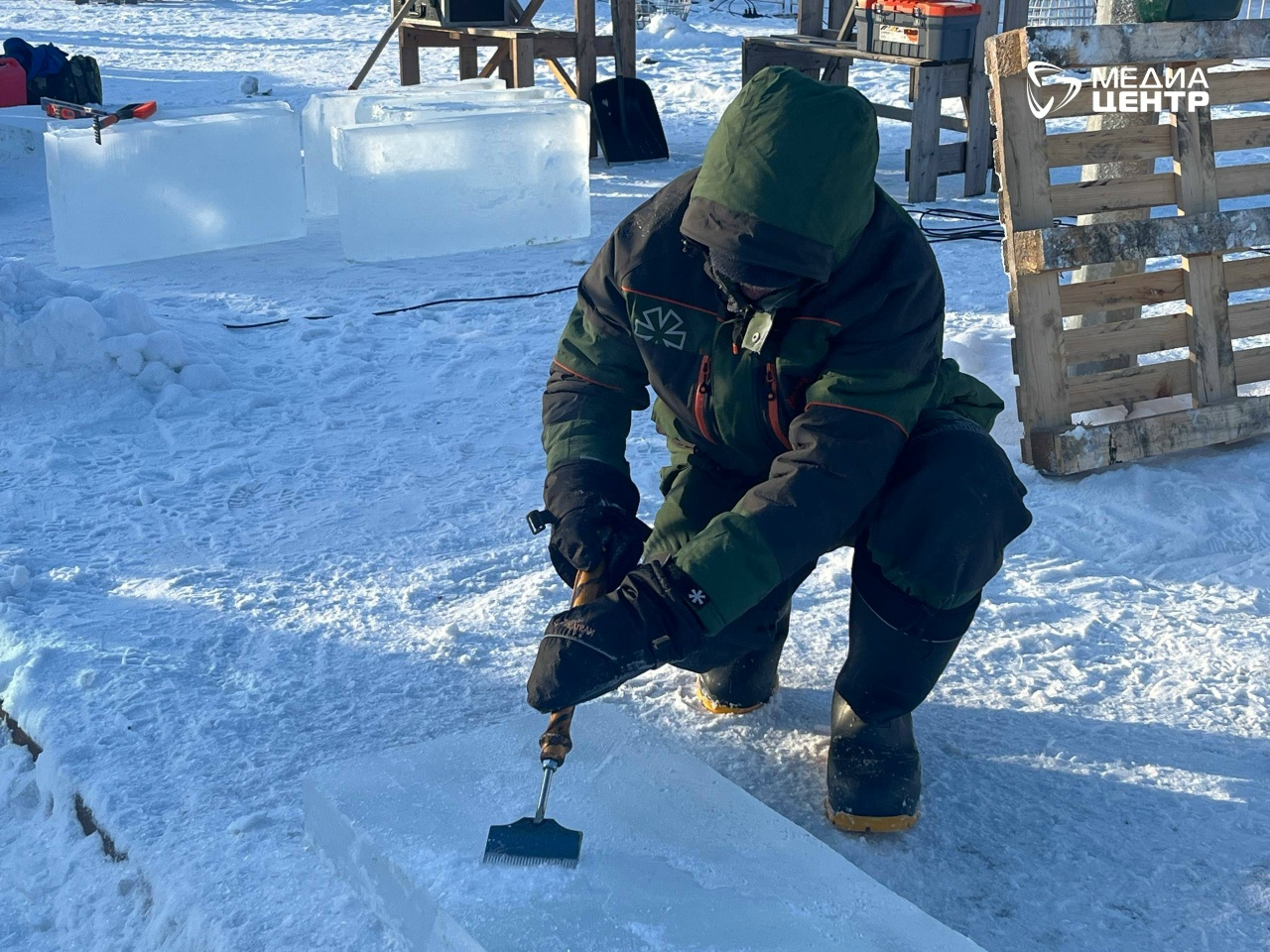 Для мастеров подготовили 160 ледяных блоков, каждый весом по 100-120 кг. Лёд заготовили на Климовском озере в Тарногском округе.