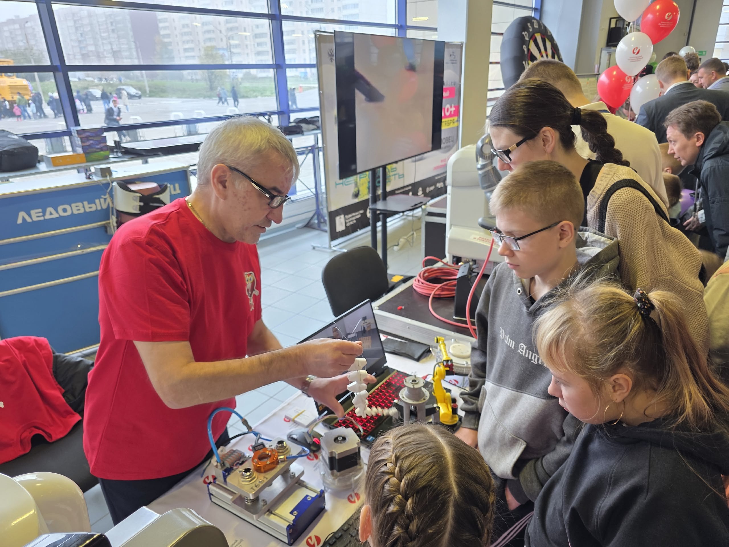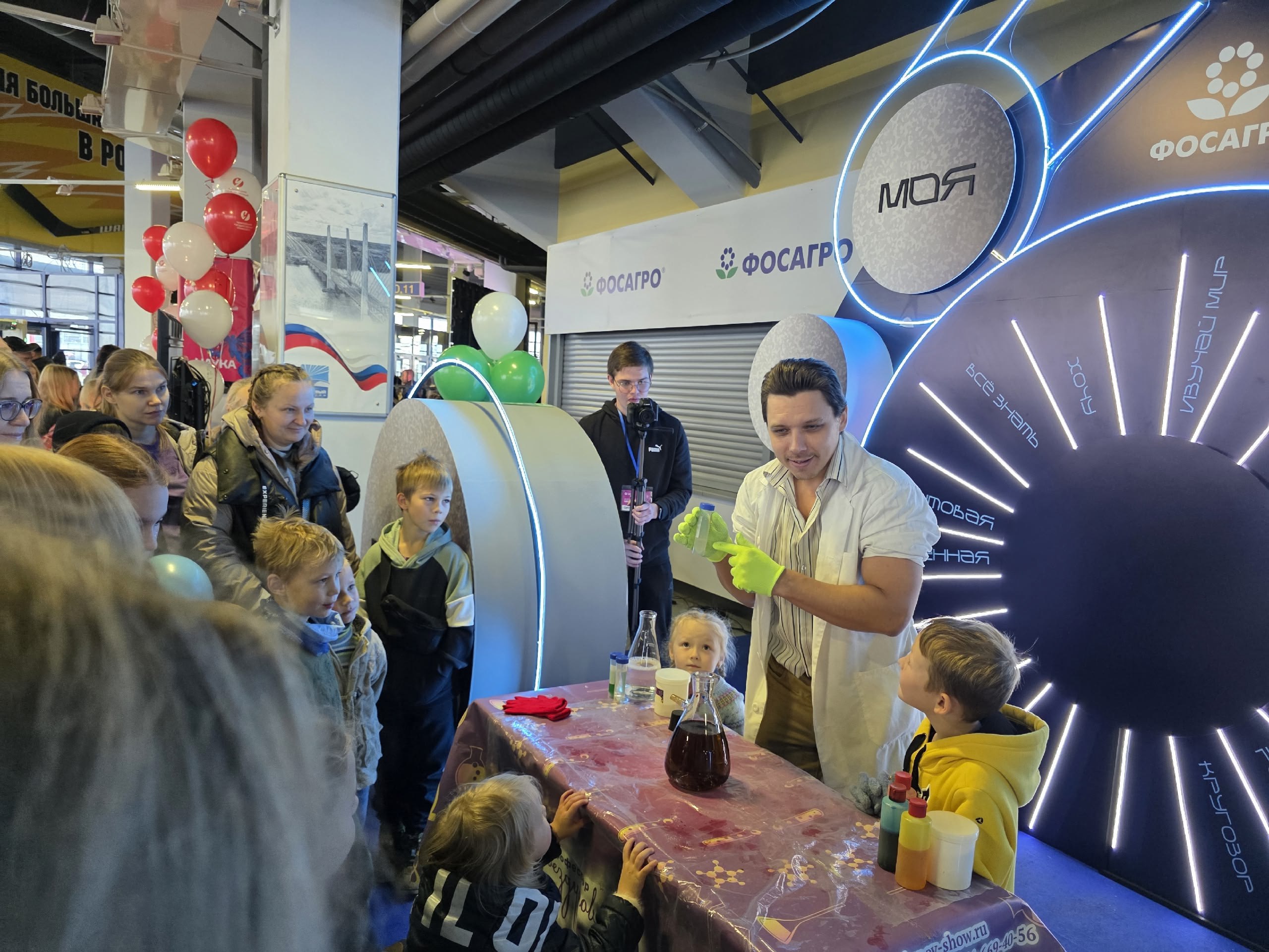 Здесь работает более 30 интерактивных и познавательных площадок. Взрослые и дети участвуют в мастер-классах и занимательных опытах. Также около Ледового дворца проходит выставка спецтехники.