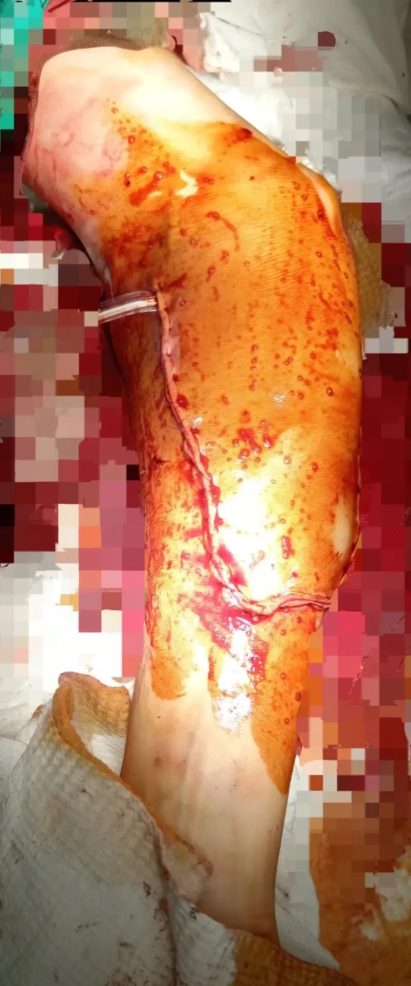 В экстренном порядке врачи провели первичную хирургическую обработку раны и восстановили целостность поврежденных тканей. В ходе операции, которая длилась около полутора часов, хирурги остановили кровотечение, а также наложили швы на поврежденные сосуды, мышцы и сухожилия. Конечность удалось сохранить.