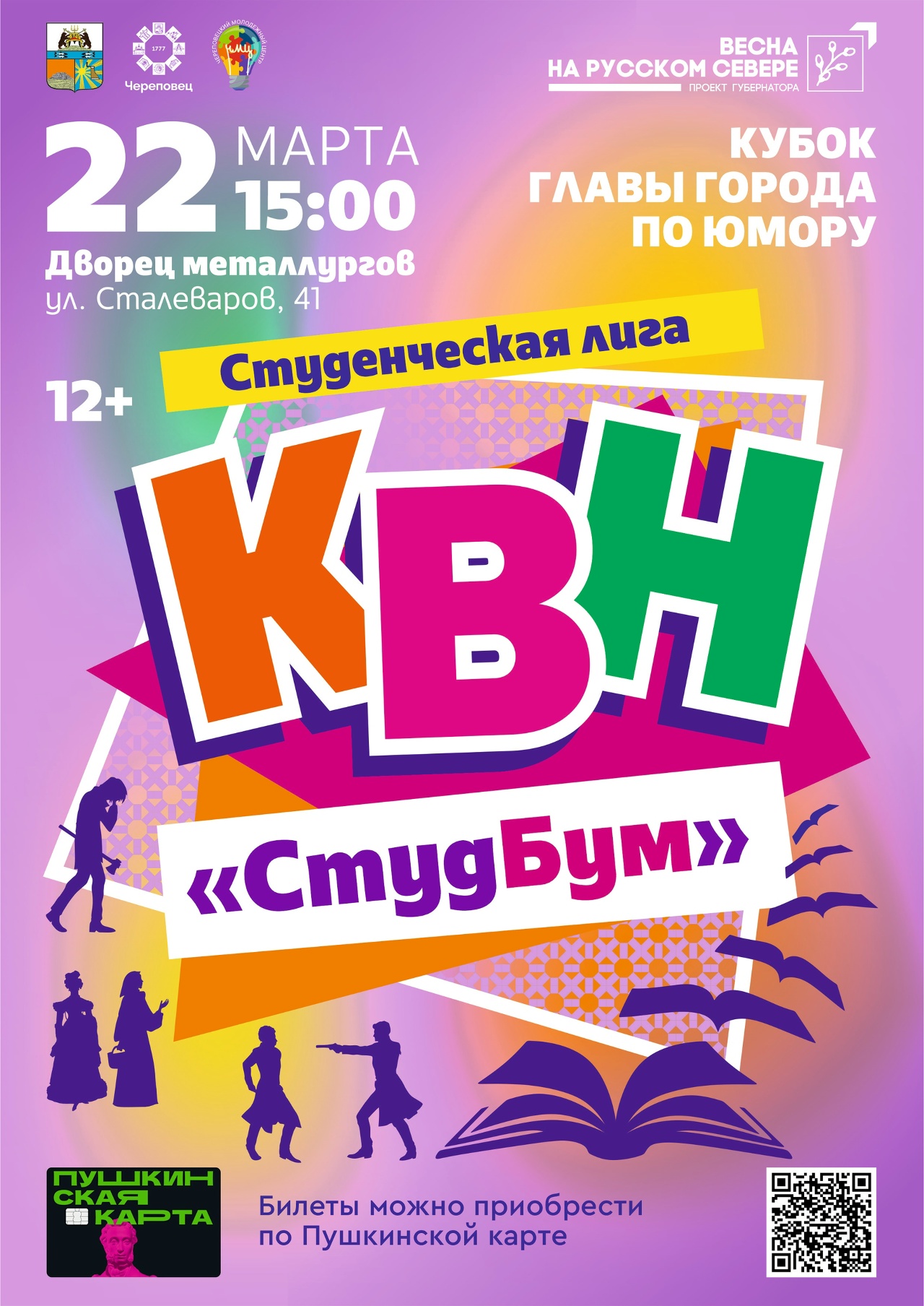 15:00 – Кубок Главы города по юмору (12+). Битва остроумия: лучшие команды Череповца сразятся за звание самых смешных. Дворец металлургов (ул. Сталеваров, 41)
