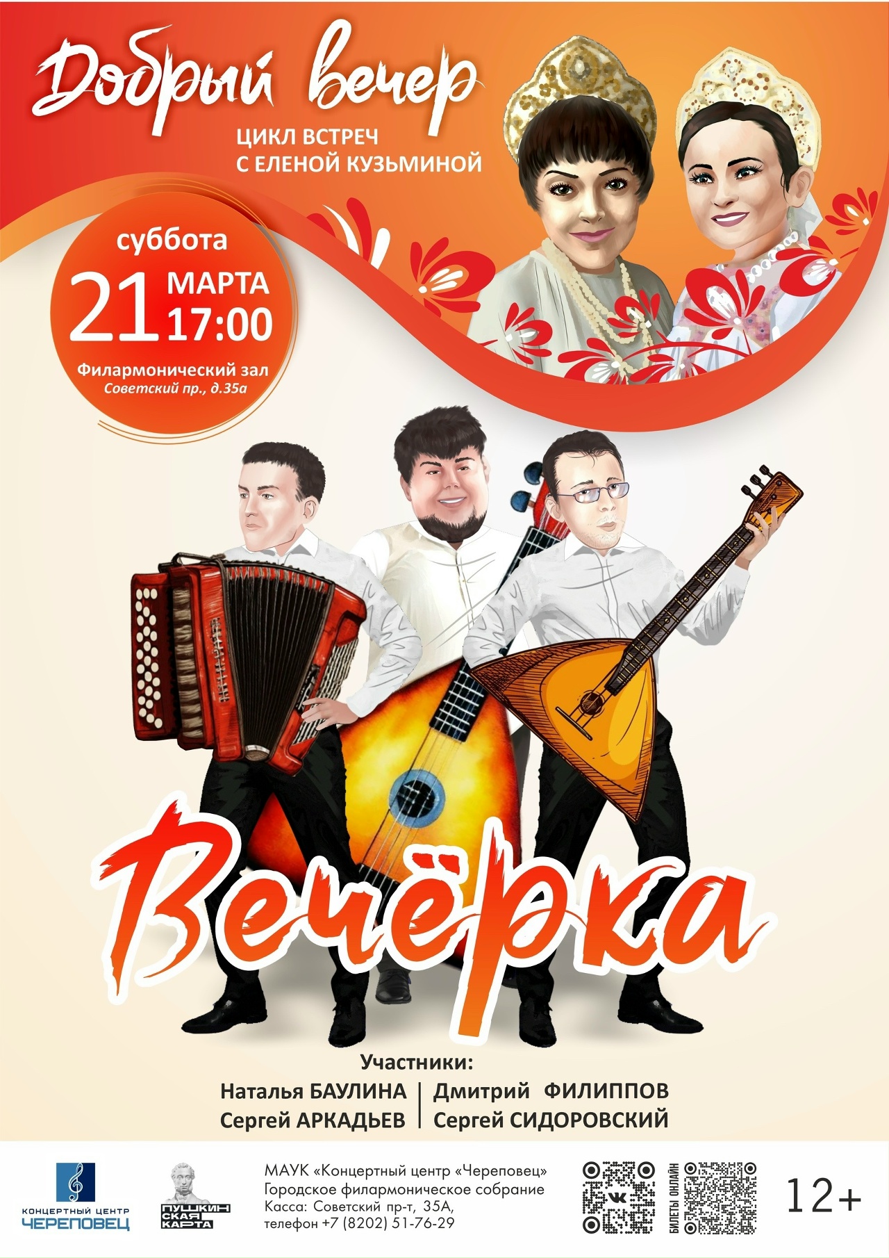 17:00 – музыкальный вечер «Четверть века на филармонической сцене» (12+) из цикла «Добрый вечер с Еленой Кузьминой». В гостях – исполнительница народных песен Наталья Баулина. Филармония (Советский пр., 35а)